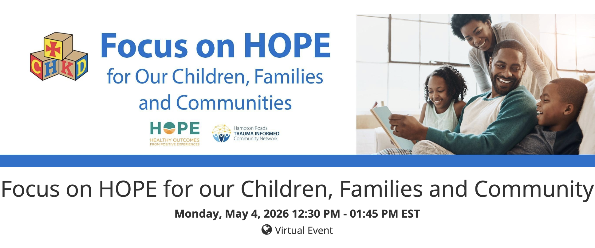 The Hampton Roads Trauma Informed Community Network (HRTICN) welcomes you to attend this FREE virtual workshop to learn about resilience and become an advocate for HOPE! The research is in! Key positive childhood experiences (PCEs) prevent and mitigate the negative effects of adverse childhood experiences (ACEs). Participants will learn about the four building blocks of HOPE (Healthy Outcomes from Positive Experiences) identified by the HOPE National Resource Center. You will feel encouraged both personally and professionally knowing you can make a positive difference for our children, families, and communities. Join us to listen, learn, reflect, contribute, and commit to creating a resilient Virginia. Learn more and register!
