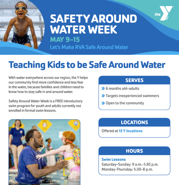 The YMCA is helping teach children and families how to be safe around water with a free introductory swim program May 9-15 at 13 different Y locations! View and download the flyer in English or Spanish for more information and to register!
