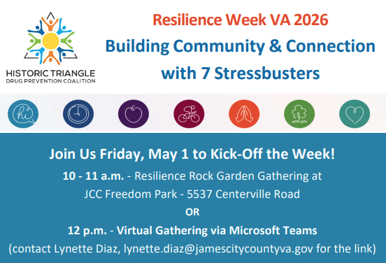 Join the Historic Triangle Drug Prevention Coalition to kick off Resilience Week on May 1 with a Resilience Rock Garden Gathering 10:00-11:00am at JCC Freedom Park, or a virtual gathering on Microsoft Teams led by the Trauma and Resiliency Committee. View and download the flyer for details!