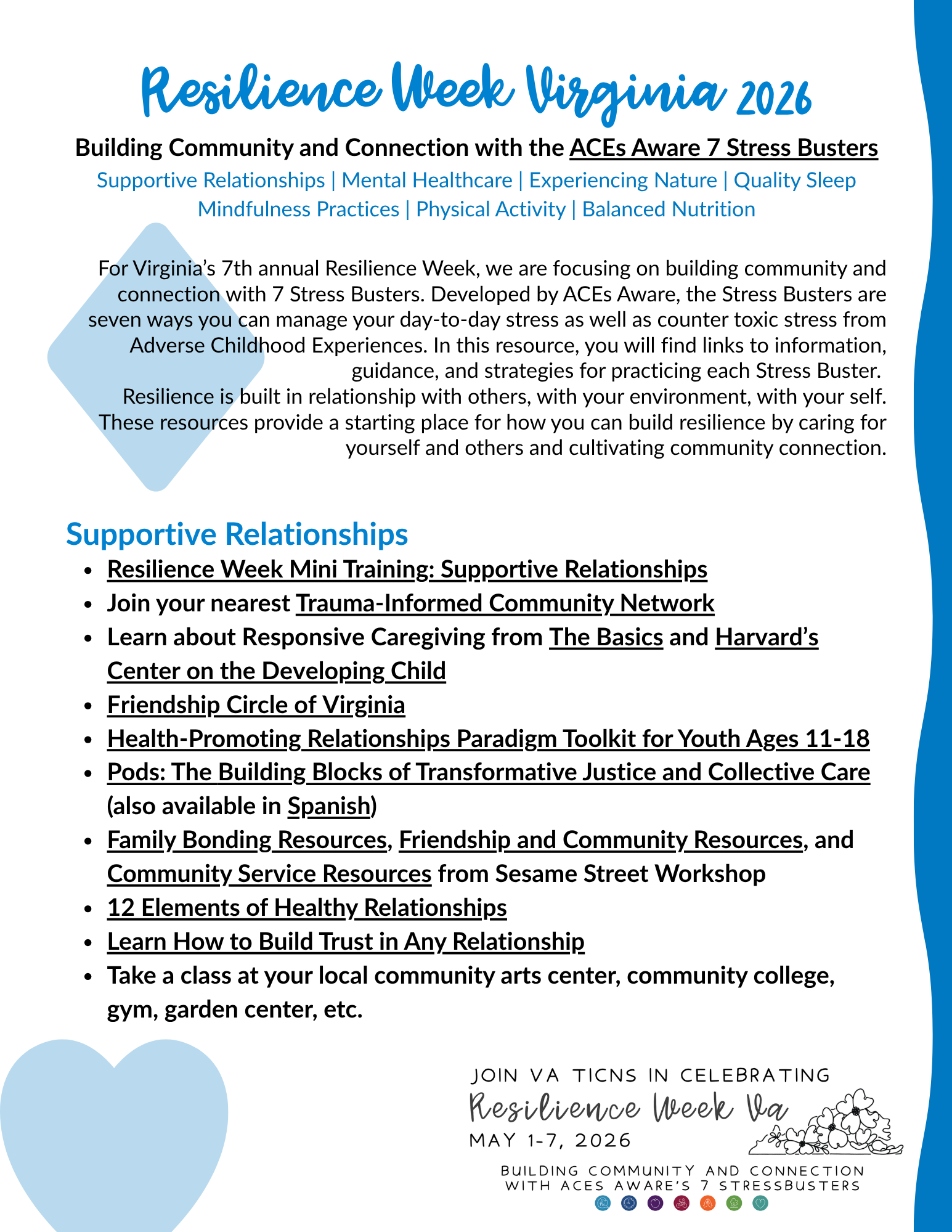 For Virginia’s 7th annual Resilience Week, we are focusing on building community and connection with 7 Stress Busters. Developed by ACEs Aware, the Stress Busters are seven ways you can manage your day-to-day stress as well as counter toxic stress from Adverse Childhood Experiences. In this resource, you will find links to information, guidance, and strategies for practicing each Stress Buster.